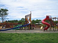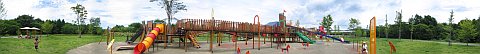 | この辺では見かけない遊具がたくさんある公園です。ミノムシ型のブランコや、クネクネ曲がった登り棒。すべり台は6機もありますし、ぐる〜っと円形に囲んだ橋のような連絡橋で、各遊具がつながれていて目新しさがある公園です。 |